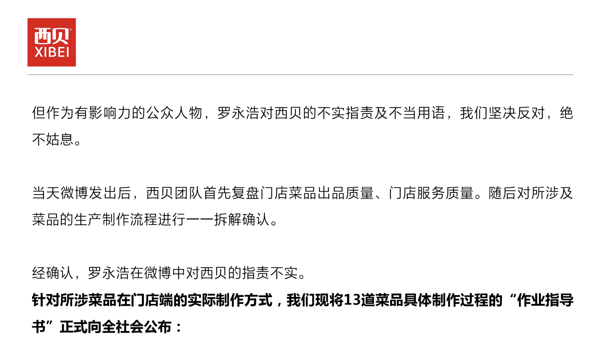 9月12日下午,西贝发布致顾客的一封信称,经确认,罗永浩在微博中对西贝的指责不实。其还公布了罗永浩此前购买的13道菜品具体制作过程。