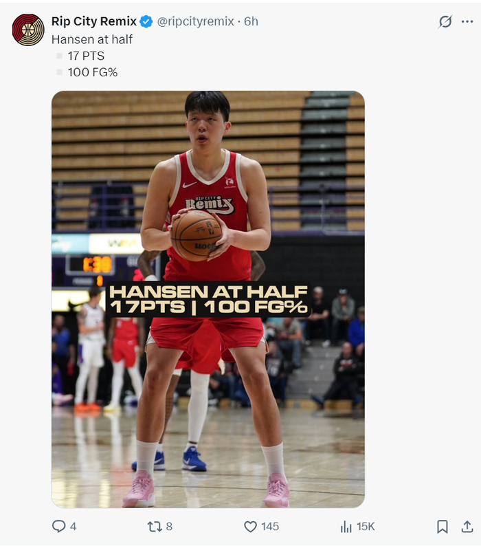这场比赛中国球员杨瀚森的发挥也很出色,他在首节5分钟里4中4拿到9分,各种篮下的勾手十分精准,次节4中4拿到8分,上半场杨瀚森弹无虚发8中8拿到17分,混音官方都为他点赞。